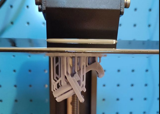 Hier wird die Druckplatte in ein mit flüssigem Kunstharz gefülltes Bad eingelassen. Ein Laser härtet dann Schicht für Schicht die Konturen des Teils aus.